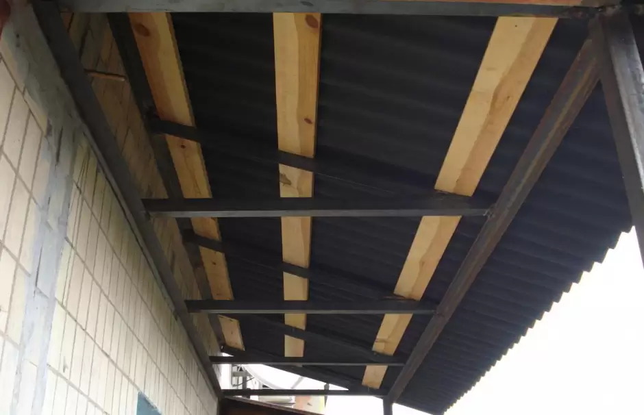 Установка деревянной крыши с кровлей из профнастила на балконе